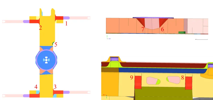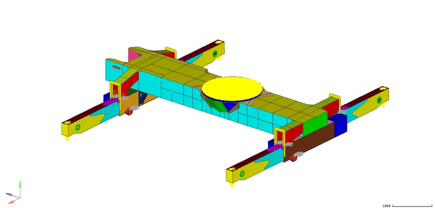 车架截面尺寸 650×1100mm,支腿截面尺寸 380×250mm;约定车架中回中心为坐标原点,正后方为+X,正右方为+Y,正上方为+Z。车架主体采用薄板件焊接而成,因此采用壳单元来模拟,焊缝连接为将壳单元作延申相交处理,中回座圈采用六面体模拟,支腿搭接处采用 MPC 滑移面进行模拟,有限元模型见图 1: