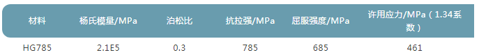 车架支腿主体采用 HG785 钢,其屈强比σs/σb≥0.7,因此按照第二种方式计算其许用应力,其相关参数如下表所示: