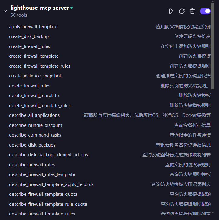 在打开的配置页面输入我们在 MCP 广场获取到的 SSE URL 连接地址后保存,可以看到我们的腾讯云 Lighthouse MCP Server 已经连接成功,同时可以看到当前 MCP Server 所包含的 50 个工具,及每个工具的具体名称