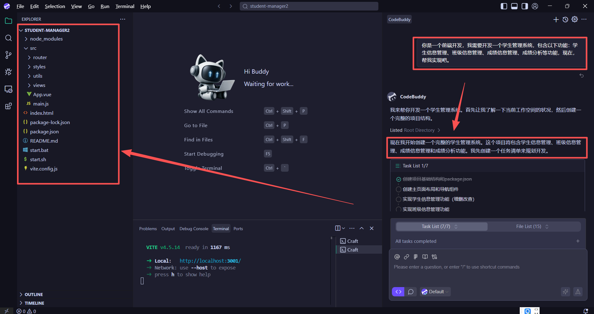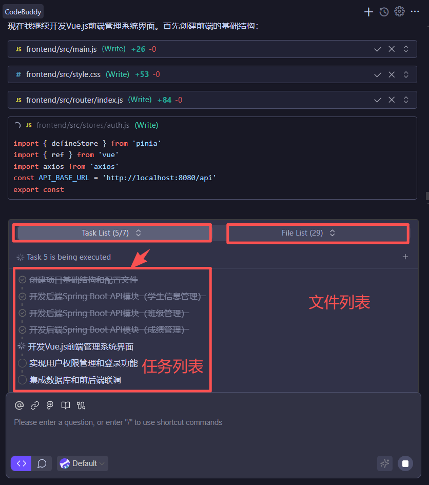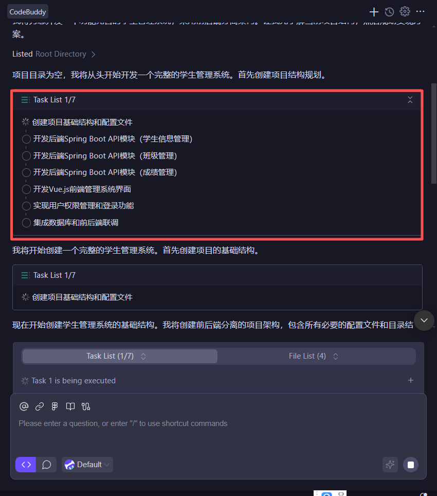 那么下面我们就可以发送我们的需求来让 CodeBuddy IDE 帮助我们实现我们的学生管理系统了。在接收到我们的需求后,CodeBuddy 会自动根据我们的需求内容分析并制定项目规划,生成任务列表