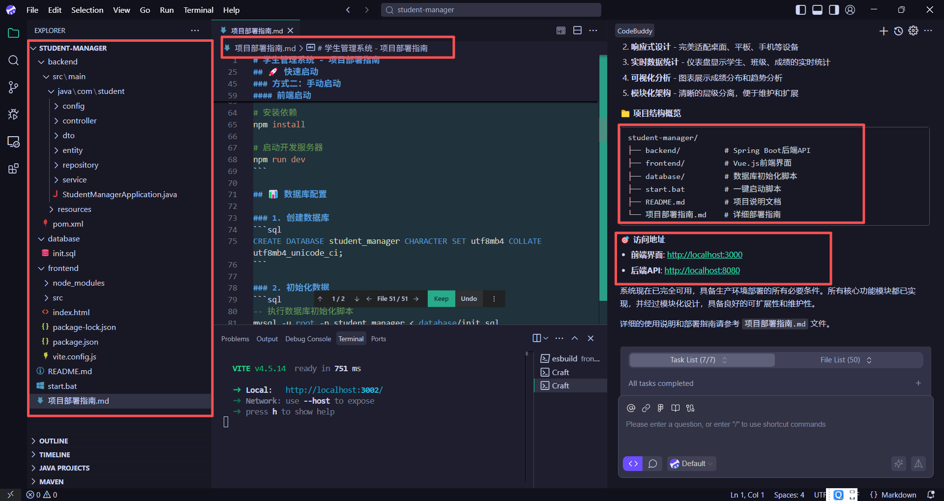 等待所有内容开发完成后,CodeBuddy 会对本次需求的全部开发内容做一个汇总,同时介绍使用的技术架构,快速启动命令,默认账户,系统特色功能,项目文件结构概览等内容