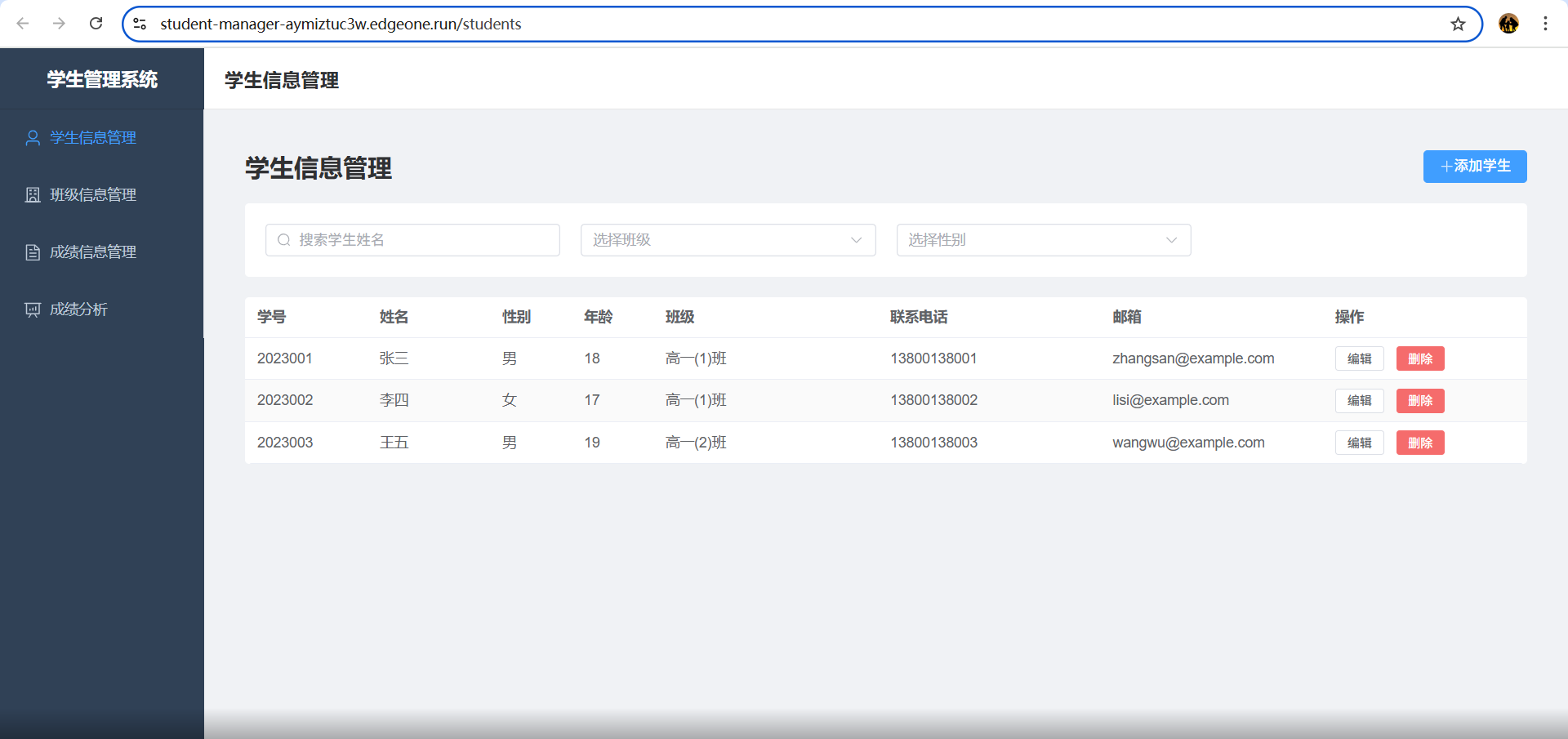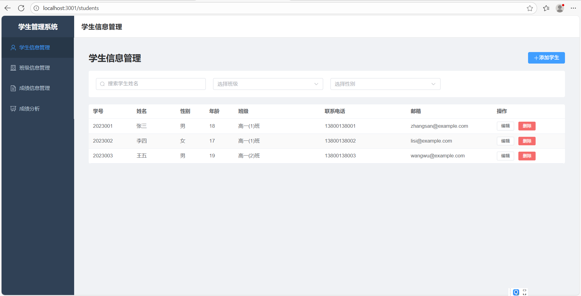 本地部署完成后,可以通过访问 http://localhost:3001 链接来查看我们的学生管理系统功能