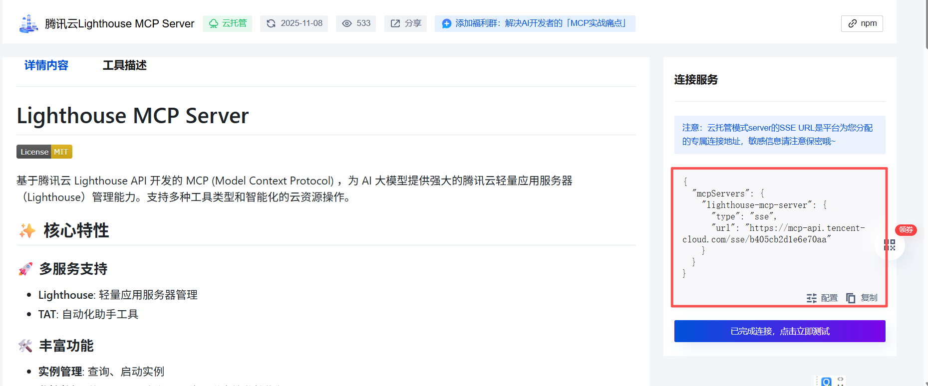 在打开的 MCP Server 页面右侧输入我们上面获取到的 SecretId、SecretKey 并连接,连接成功后可以获取到我们的 MCP Server SSE 连接配置地址