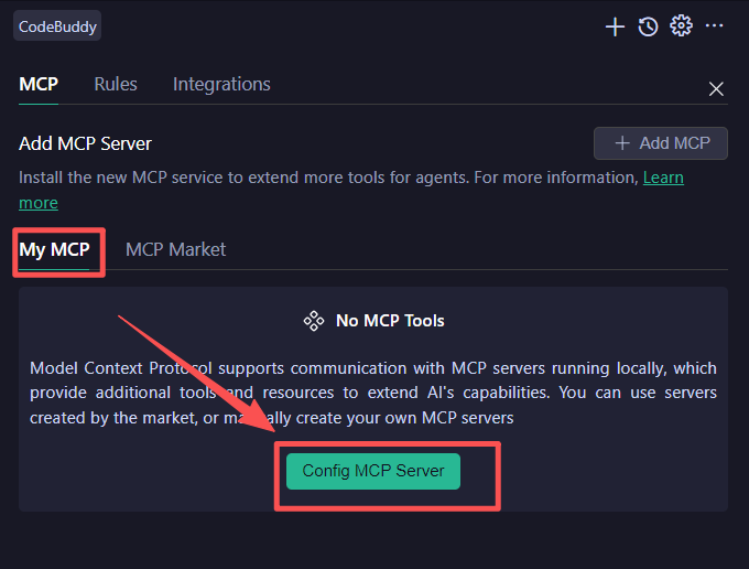 在 CodeBuddy IDE 开发工具打开【My MCP】-【Config MCP Server】