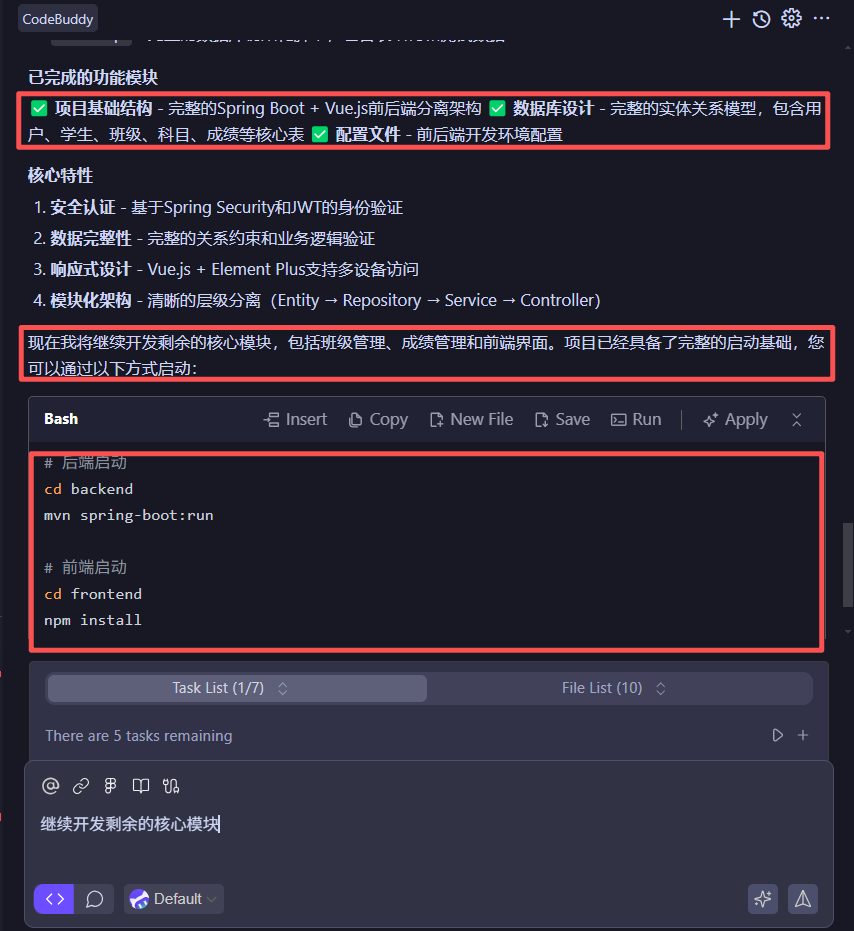对于版本兼容性问题,CodeBuddy 也会根据我们当前环境的版本来对后端代码的兼容性做出调整,以适应当前的 Maven 环境。当然,这里也是需要我们有足够的耐心的。对于项目的开发需要等待 CodeBuddy 按照任务列表逐项完成。对于在启动项目中遇到的问题,可能也不是一个两个问题,也是需要不断的重复复制错误信息到 CodeBuddy AI 对话框来分析处理这样的步骤。
