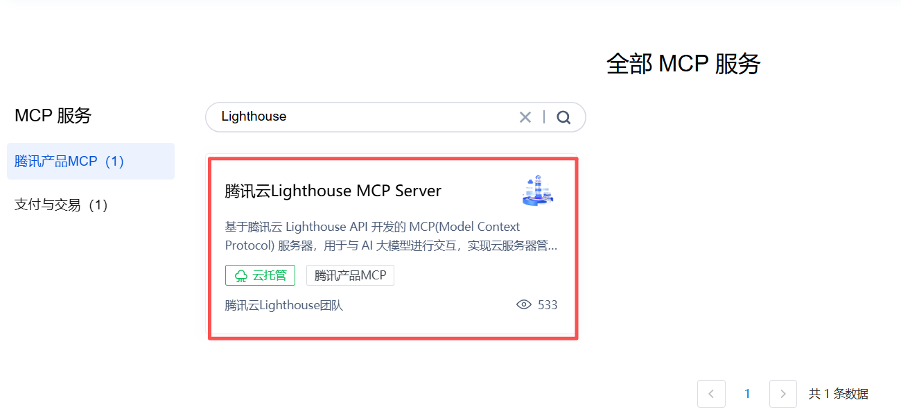 在腾讯云 MCP 广场:https://cloud.tencent.com/developer/mcp 搜索【Lighthouse】可以看到我们需要的 MCP Server