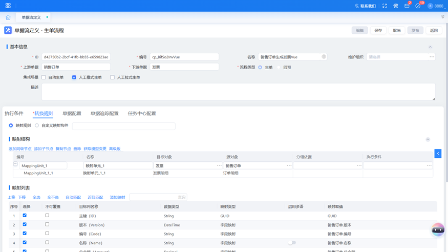 在【企业数字化云平台】中,打开我的应用,找到【流程平台】-【业务流平台】-【单据流定义】,编辑编号为 cp_BifSo2InvVue 名称为销售订单生成发票 Vue 的生单流程。
