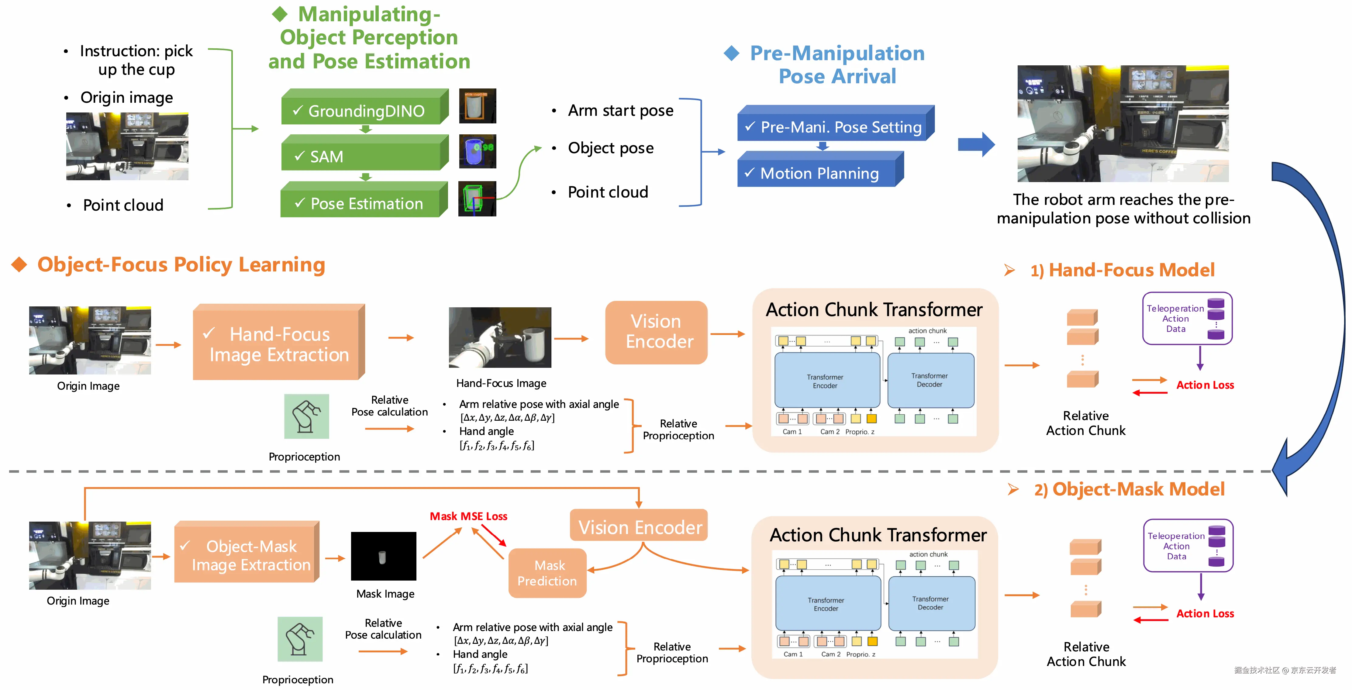 技术突破:如下图所示,提出了基于末端模仿的泛化操作方法,聚集于统一的操作轨迹学习,能在较少的数据下实现较强的位置泛化能力,涉及核心模块包括:操作物体感知与位姿估计、预操作位姿到达和聚集物体的策略学习。此外,设计了聚集于物体的视觉特征提取模块,增强对核心操作区域的感知。