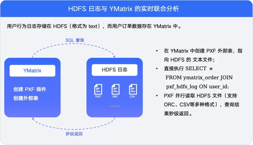 你想在 YMatrix 里直接 JOIN Oracle 的客户表和 HDFS 的生产日志表,只需创建一张外部表,告诉 PXF"数据存在哪里、用什么格式",后续查询就像操作本地表一样简单。数据不用跨网络搬迁,分析直接基于最新状态,报表从 "T+1" 变 "秒级更新",ETL 团队的维护压力也大幅降低。