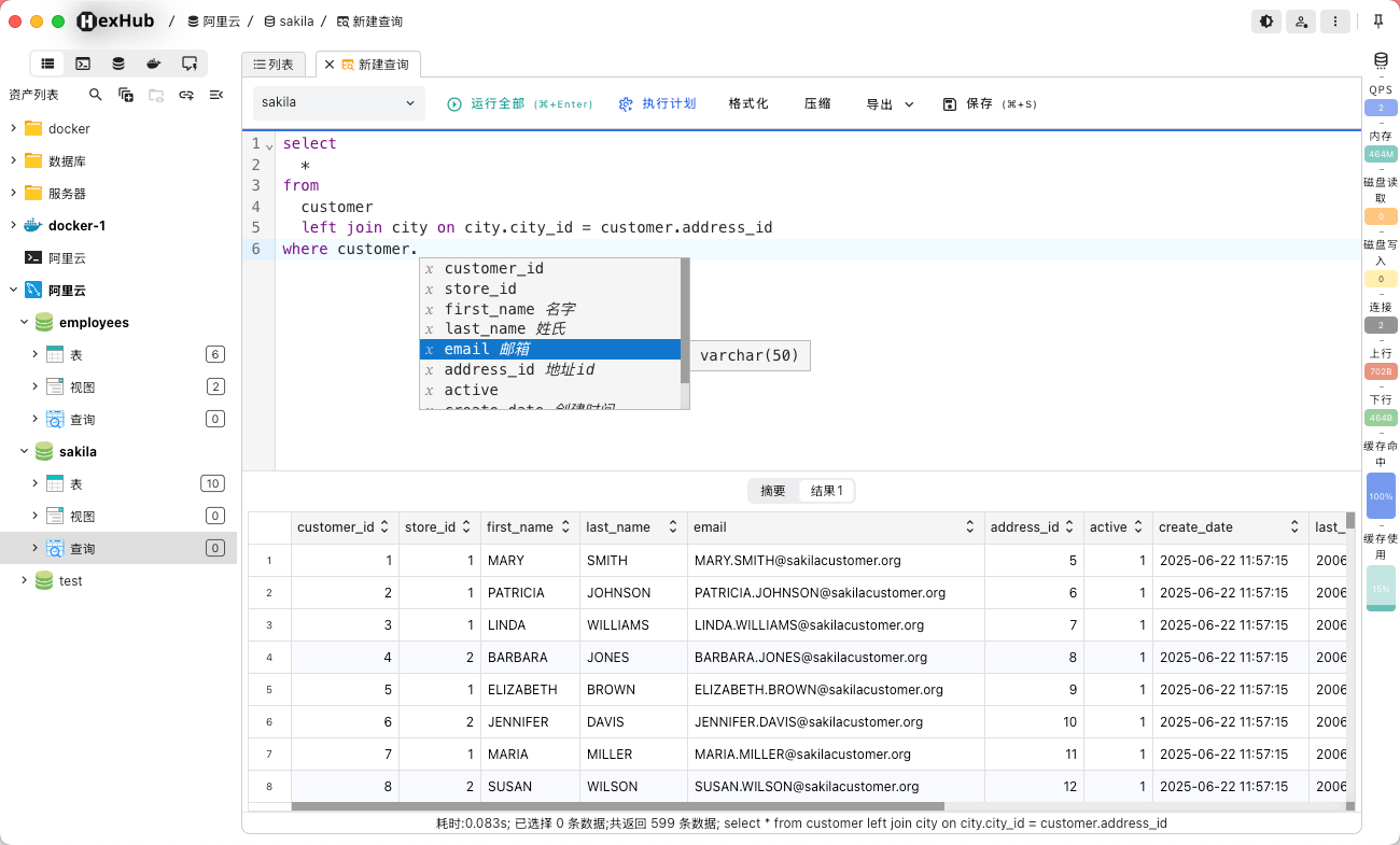 支持多种数据库管理(Redis、MySQL、ClickHouse、MariaDB、PostgreSQL、SQLite),支持智能 SQL 编辑器(自动完成、代码作色、格式化、流式查询、执行分析、结果导出)、数据内联编辑、表结构编辑、实时面板、数据字典导出、SQL 导入导出、SLSX 导入导出等。