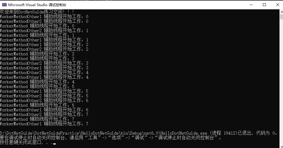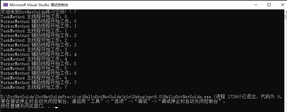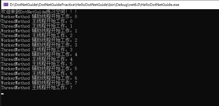 for (int i = 0; i < 8; i++) { Console.WriteLine($"TaskMethod 主线程开始工作:{i}"); Task.Delay(100).Wait(); } } private static void WorkerMethod() { for (int i = 0; i < 8; i++) { Console.WriteLine($"WorkerMethod 辅助线程开始工作:{i}"); Thread.Sleep(100); } }