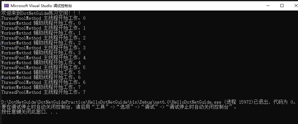 for (int i = 0; i < 8; i++) { Console.WriteLine($"ThreadPoolMethod 主线程开始工作:{i}"); Thread.Sleep(100); } } private static void WorkerMethod() { for (int i = 0; i < 8; i++) { Console.WriteLine($"WorkerMethod 辅助线程开始工作:{i}"); Thread.Sleep(100); } }