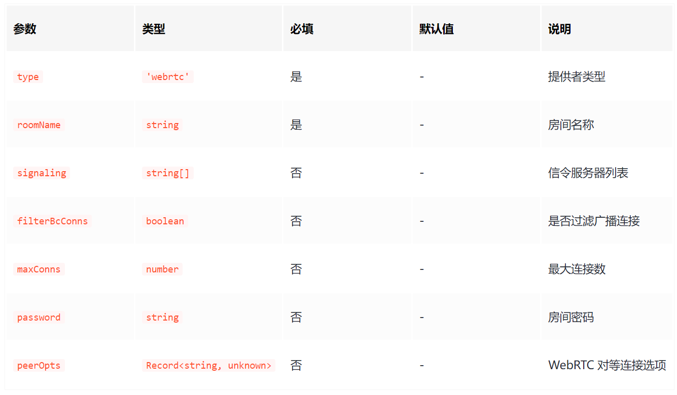 注意: 需要额外安装 WebRTC 依赖 pnpm i y-webrtc。使用这种方式采用点对点连接,不需要中心化的 WebSocket 服务器,更适合低延迟和对网络拓扑有特殊要求的场景。