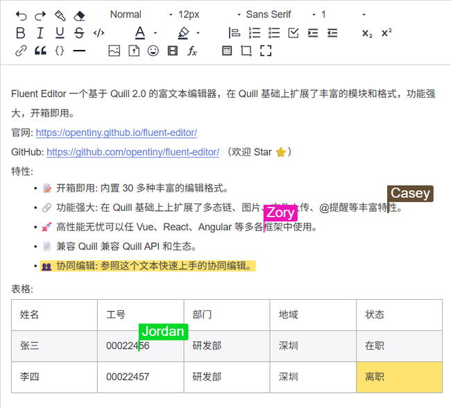 import FluentEditor, { CollaborationModule } from '@opentiny/fluent-editor'FluentEditor.register('modules/collaborative-editing', CollaborationModule, true)