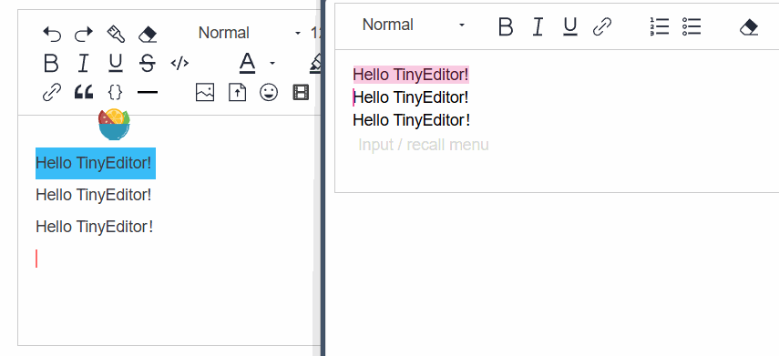 TinyEditor 是一个框架无关的富文本编辑器,既可以在原生 JavaScript 项目中使用,也可以在 Vue、React 等前端框架中使用。