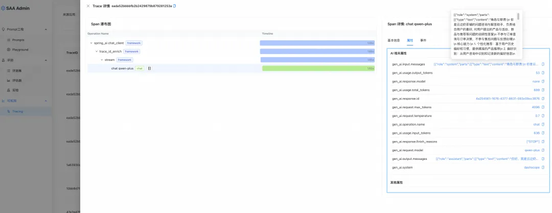 链路追踪: 完整记录每次 AI 请求的调用链路,涵盖 Prompt 渲染、模型调用、工具执行等环节。