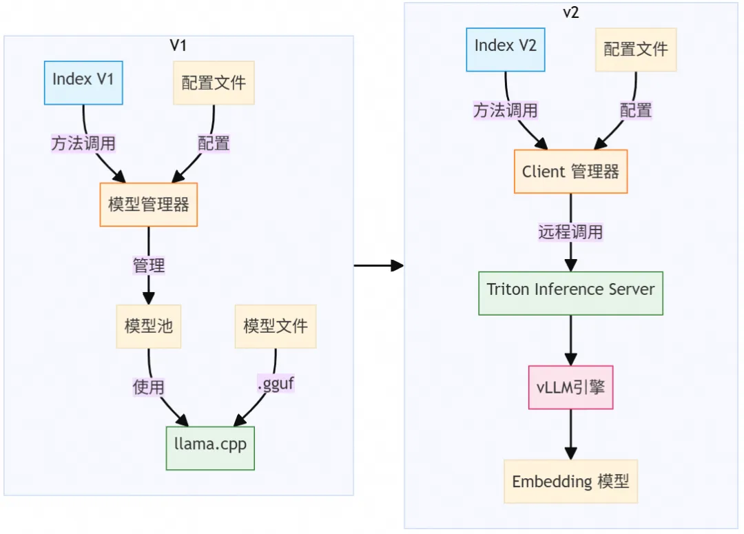 在之前的架构中,直接调用嵌入的 llama cpp 引擎进行 embedding。而在新架构中,通过发起远程调用来进行 embedding。