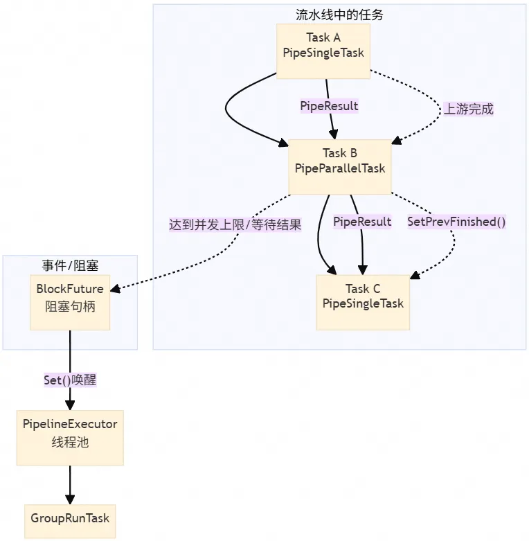 为了高效执行流水线 Task,我们还实现了以数据和事件驱动的调度框架。