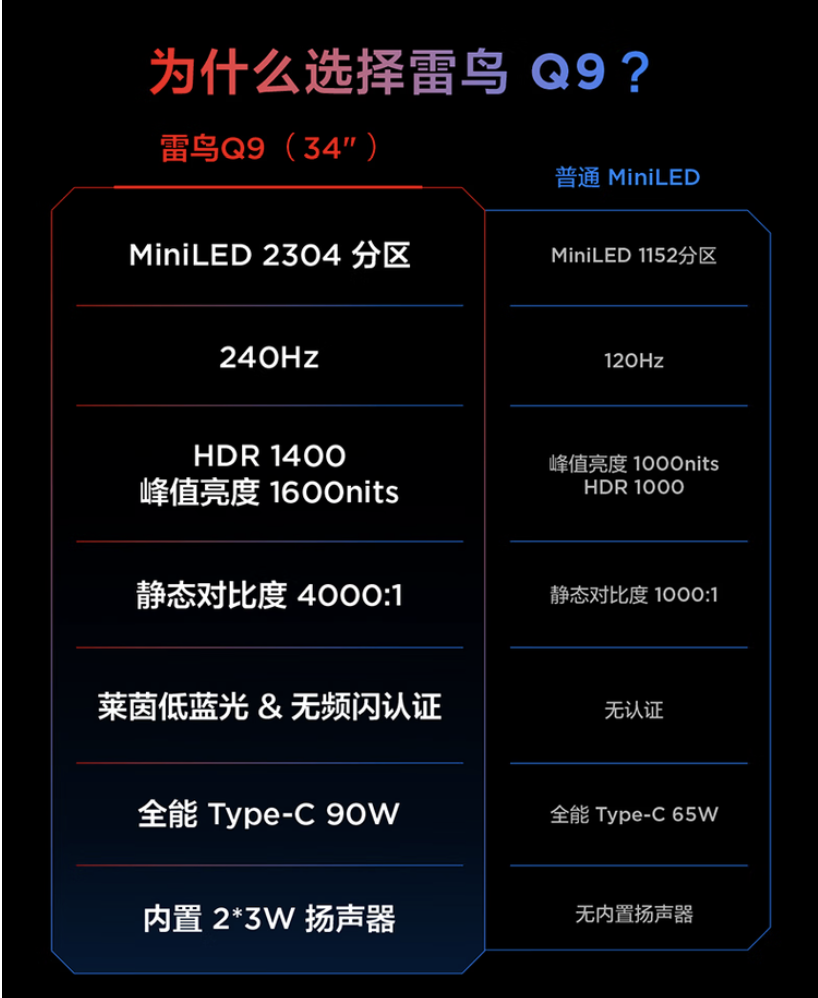雷鸟 34Q9 显示器采用华星光电新一代 HVA 面板,解决了传统 VA 面板在电竞应用中的性能瓶颈。这项突破性技术在保持 4000:1 超高对比度的同时,将响应时间缩短至 1ms GTG,实现了与 Fast IPS 相当的响应速度。与传统 VA 面板相比,HVA 面板通过材料创新和驱动算法优化,彻底解决了传统 VA 技术在电竞场景下的性能短板。这一突破为显示面板技术发展提供了新的解决方案。配合 2304 分区 Mini LED 背光系统,雷鸟 34Q9 实现了“亮部不过曝、暗部有细节”的精准控光效果。每个分区均可独立控光,控光精度相比普通显示器的 512 分区方案提升 4 倍。这种技术组合产生“1+1>2”的协同效应:HVA 面板的高对比度特性增强了 Mini LED 的控光效果,而 Mini LED 背光则弥补了传统 VA 面板在亮度和均匀性方面的不足。