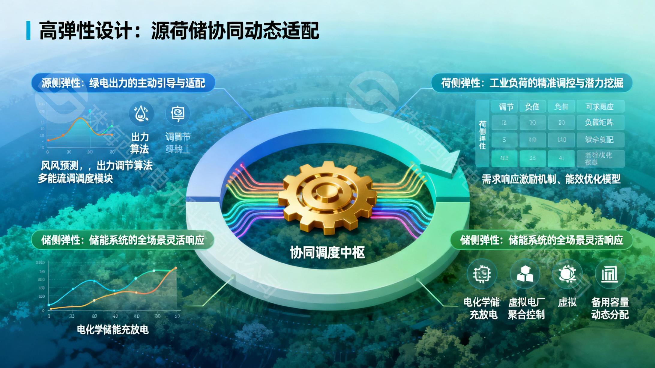 高弹性设计的核心是打破“绿电出力被动接受”的传统模式,通过“源侧可调、荷侧可控、储侧灵活”的协同调控,实现绿电与工业负荷的动态匹配,提升绿电消纳率与能源利用效率。