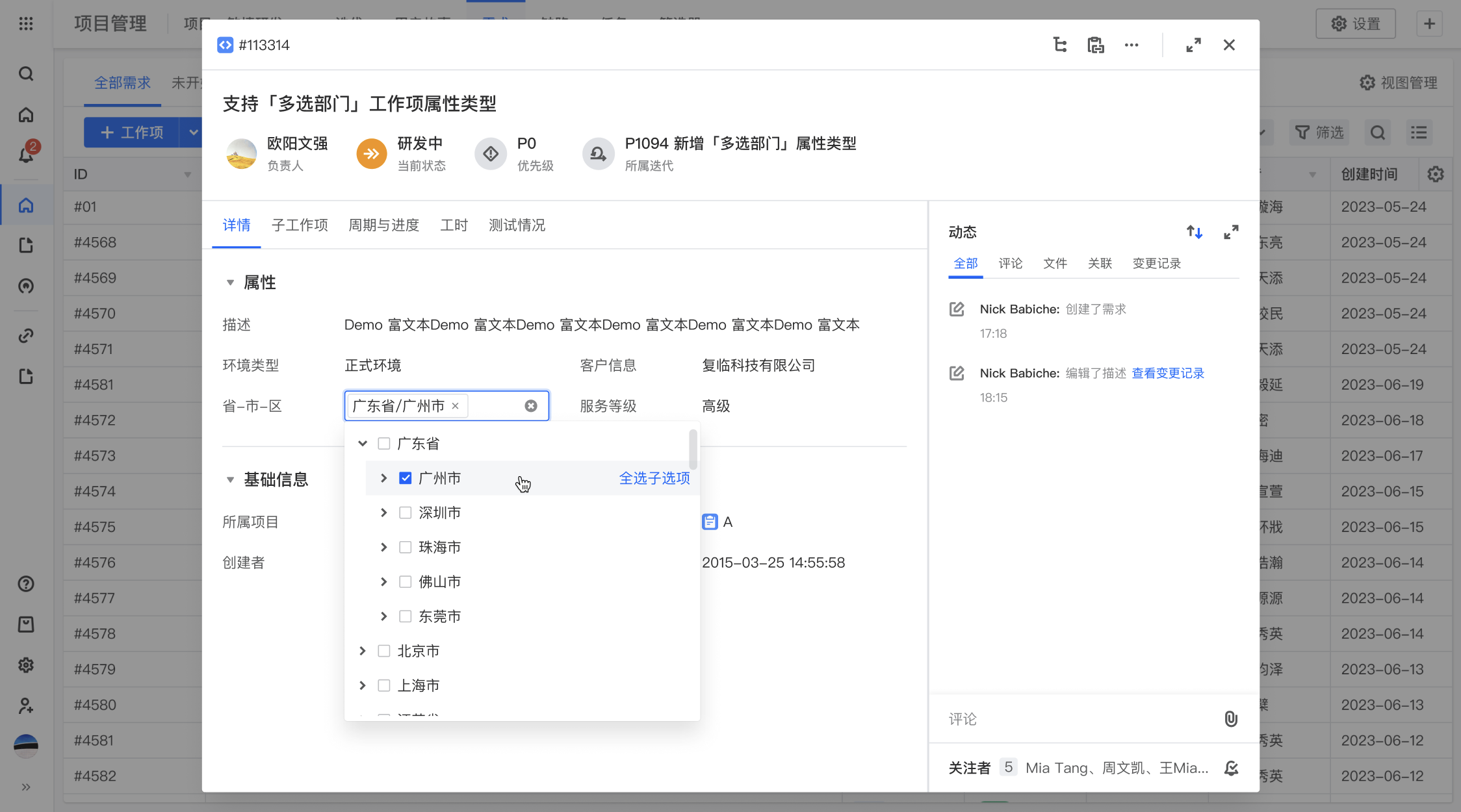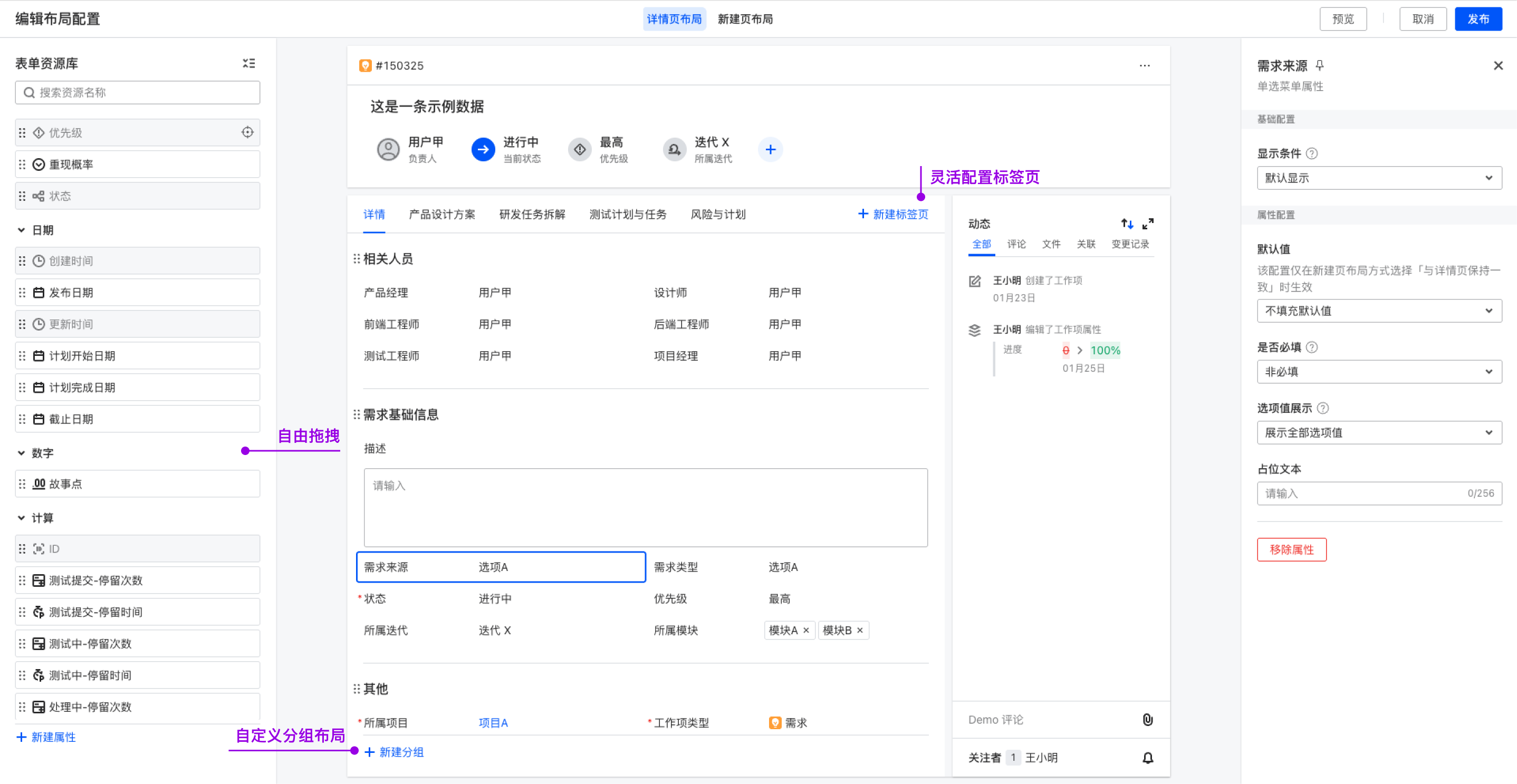 通过灵活配置工作项标签页、自定义属性的布局和分组,不同部门成员(如产品、研发、测试)可以查看与自身相关的属性,避免信息冗余,提高表单使用效率。