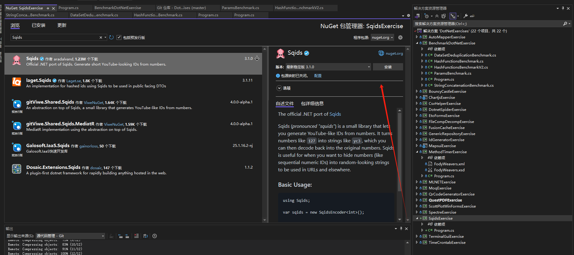 在 NuGet 包管理器中搜索 Sqids 安装:
