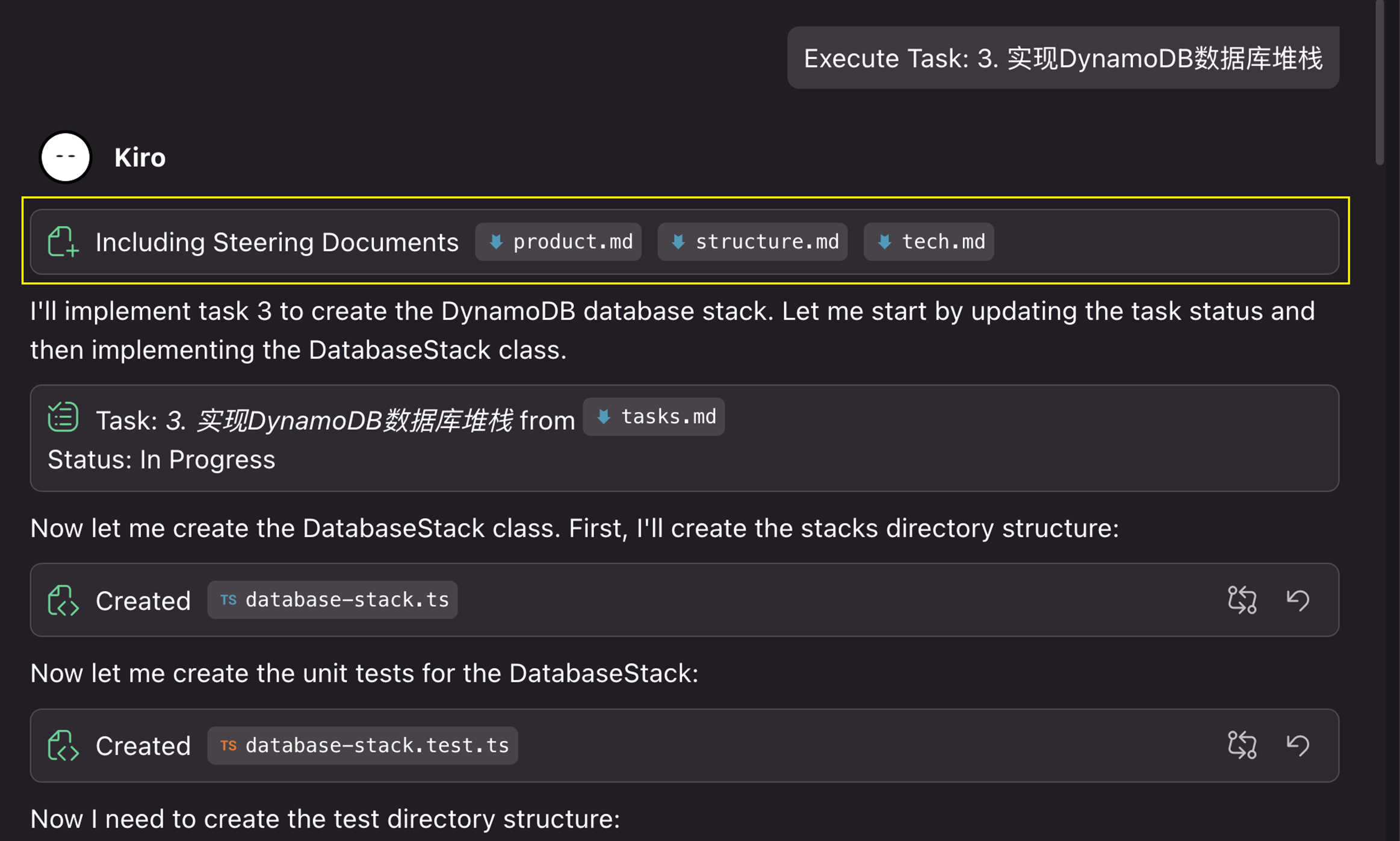 在进入任务执行前,我让 Kiro 结合 Specs 三个文档(requirements.md, design.md, tasks.md),更新了 Steering。
