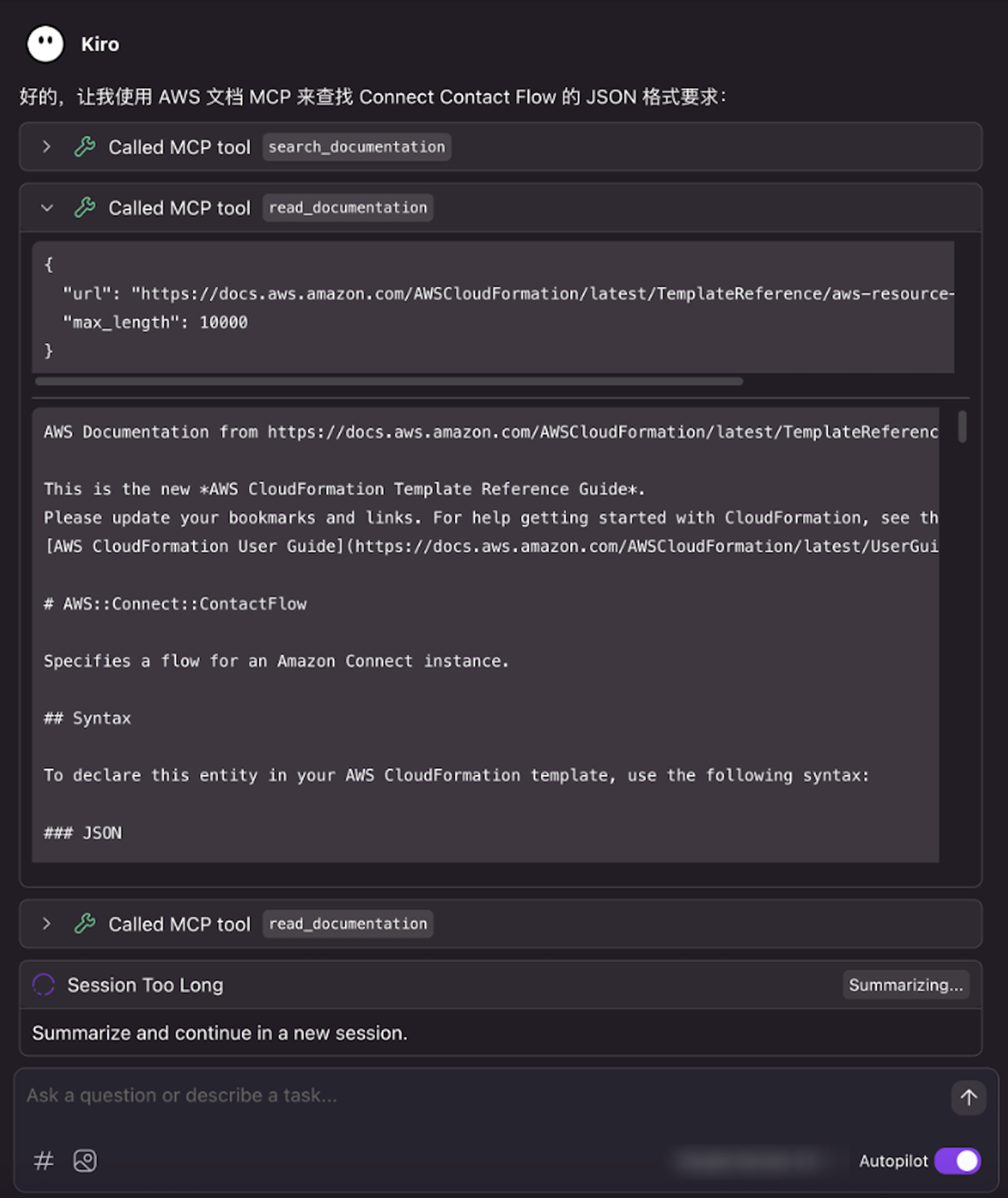 会话 Context 的管理需要优化提升。在使用中会遇到当前会话 Context 过大的情况,特别是使用 MCP 工具可能引入大量上下文内容。Kiro 此时会自动总结压缩内容并启动新的会话,目前存在两个问题: