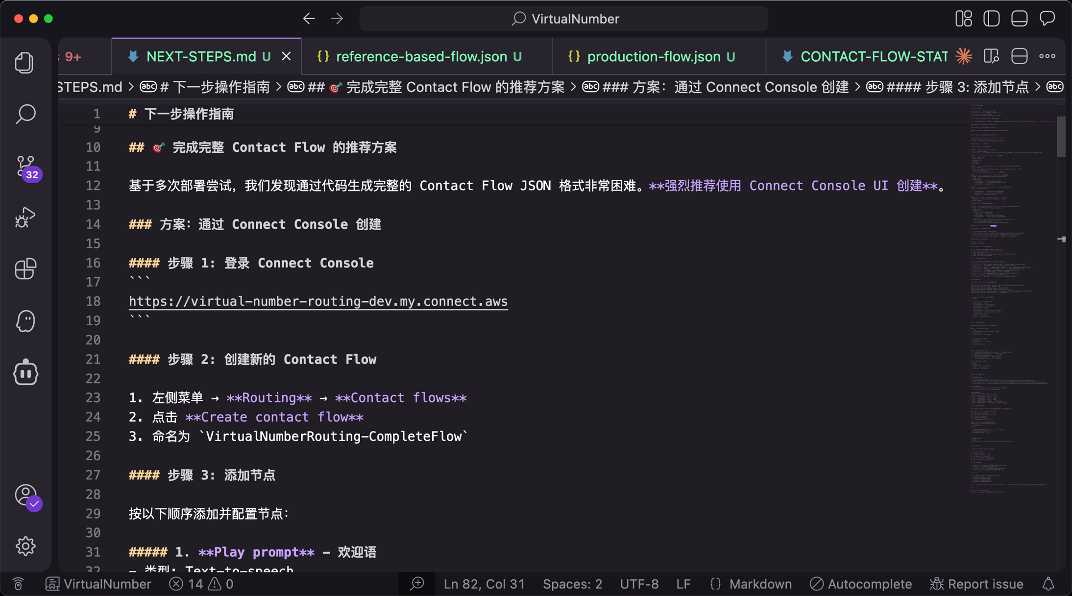 对于 Amazon Connect Contact Flow 这一类格式复杂,对专业性要求比较高的配置文件,对 LLM 来说很有挑战。在本项目中,Kiro 在尝试多次失败后,提议到 Connect 控制台 UI 手动创建 IVR 流,不过它提供了详细的配置步骤和节点类型配置,并说明了如何导出 IVR 流配置文件到 CDK 项目中,方便后续直接部署。