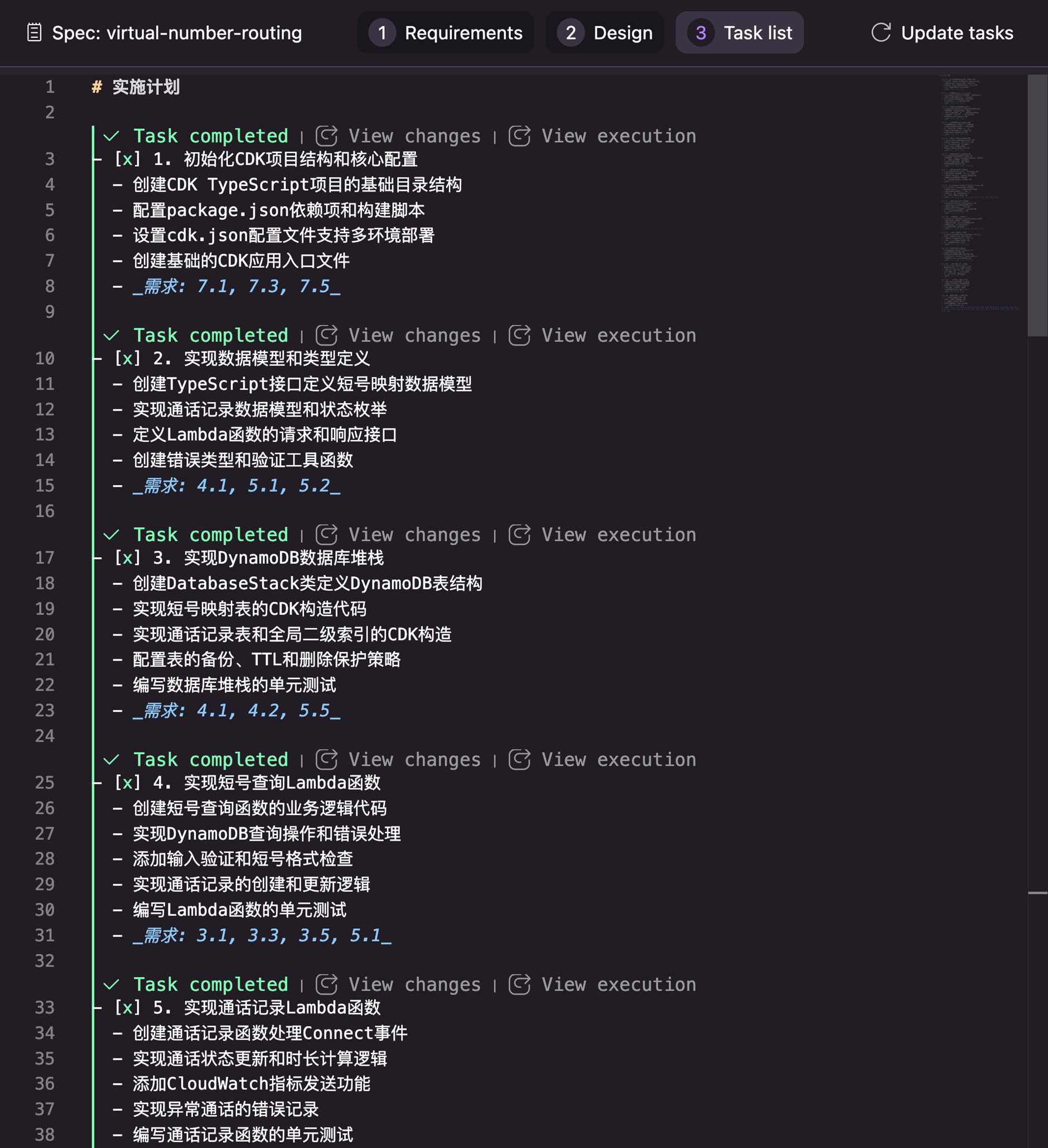 在生成初始 Design 设计文档后,我添加了一个“支持 CDK 部署”需求,Kiro 更新了需求文档和设计文档,之后转到实施计划阶段,生成开发任务