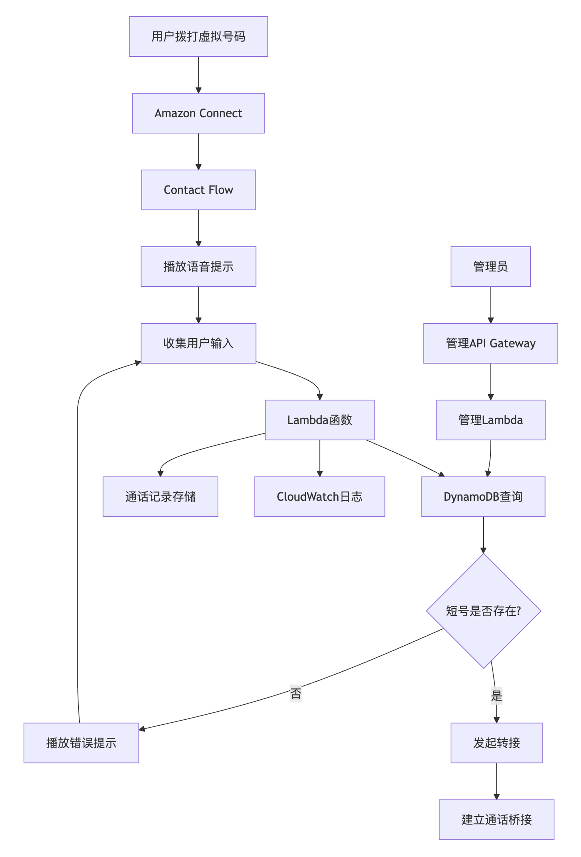 指定号码呼叫+输入短号(分机号)。指定号码是正常普通号码。当呼叫指定号码后,会自动接通并收到输入短号/分机号的提示,输入短号后再转接到真实的号码。这种方式只需要少量的普通号码,通过生成不同的短号关联到不同的真实号码,能够持久的使用或根据需求自定义任意的有效时间。