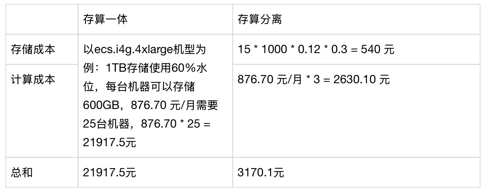 在两轮业务方的虎克平台中,单表日写入量约 1TB。为应对高数据量写入与存储成本问题,团队采用存算分离构,以阿里云 OSS 作为底层存储介质。测算结果显示,与存算一体架构相比,整体成本下降超过 80%: