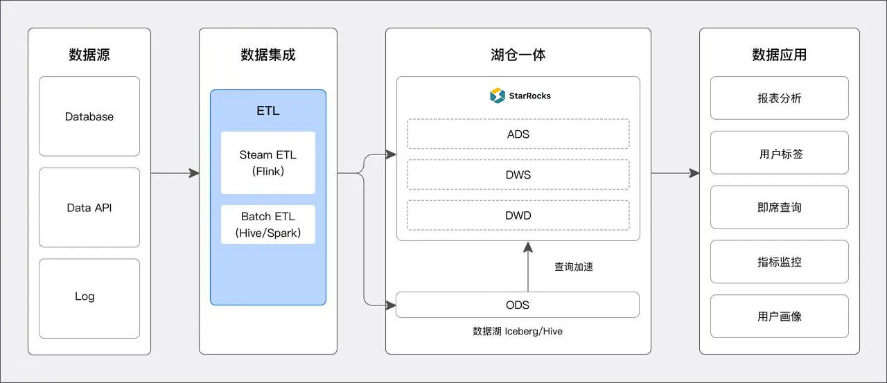 数据湖查询加速: 将 ODS 层数据写入数据湖中,DWD、DWS、ADS 层则存储在 StarRocks 中。