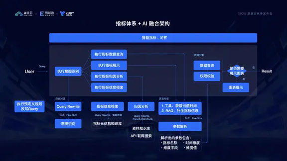 Query 处理与意图识别:借助 CoT(思维链)、Few-Shot 等技术,改写优化用户原始 Query,同时识别用户需求类型,如指标查询、展示、归因分析或信息检索。