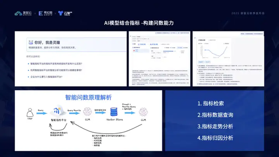 智能引擎:基于 AIWorks 平台构建,负责将用户自然语言问题进行语义理解、意图识别,转化为结构化指标元数据查询请求,提升用户与数据交互效率。