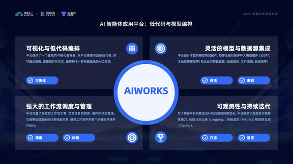 AI 的功能如此丰富强大,那企业又该如何建设自身的 AI 能力呢?袋鼠云基于行业核心挑战,推出了低代码与模型编排的 AI 智能体应用平台——AIWORKS。AIWORKS 可理解为企业 AI 能力建设的核心底座,其核心价值在于打通数据、模型、算力与业务场景之间的协同链路,实现 AI 开发、部署与迭代的高效运转。