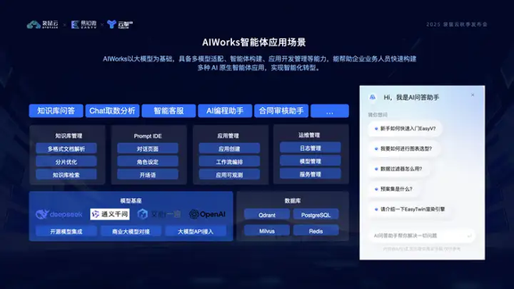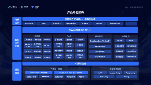 AI 基础设施层:集成 DeepSeek、Qwen 等主流大模型,搭配英伟达 H20、昇腾 910B 等不同硬件,可根据业务场景复杂度灵活选择合适模型与算力,为 AI 应用提供 “最强大脑” 支持。