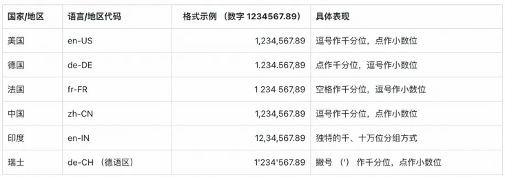 这些规则都已经被整理进 Unicode CLDR 和 ICU 数据库,现代浏览器的 Intl.NumberFormat 就是建立在这套数据之上,能根据 locale 自适应这些写法。