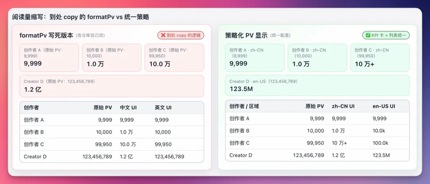 缩写策略:全站统一遵循“中文万/亿、英文 k/M/B”的梯度逻辑。