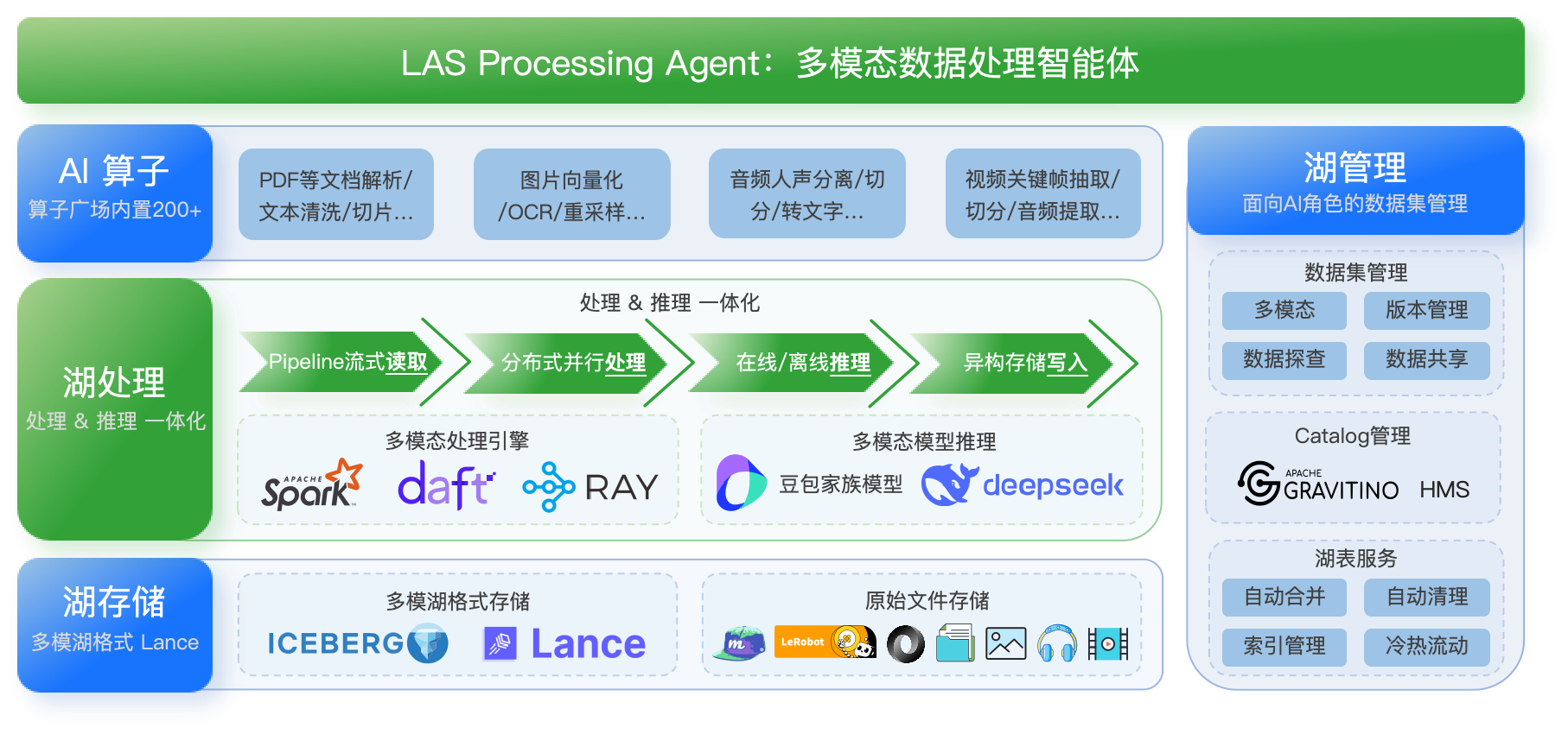 LAS AI 数据湖产品是火山引擎为企业适应 AI Agent 时代推出的新一代多模态场景解决方案,孵化于字节跳动大模型训练场景,面向多模态数据场景,提供湖存储、湖管理、湖计算三大能力、通过“湖存储 Lance+湖计算 Daft”为核心要素,针对性解决视频、图片等非结构化数据处理的痛点。