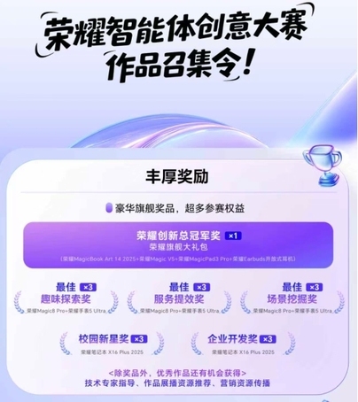 据介绍,本次平台打通后,腾讯元器上制作的智能体也可以直接参与正在进行的“荣耀智能体创意大赛”,获奖者可赢取荣耀奖品礼包以及多重激励。
