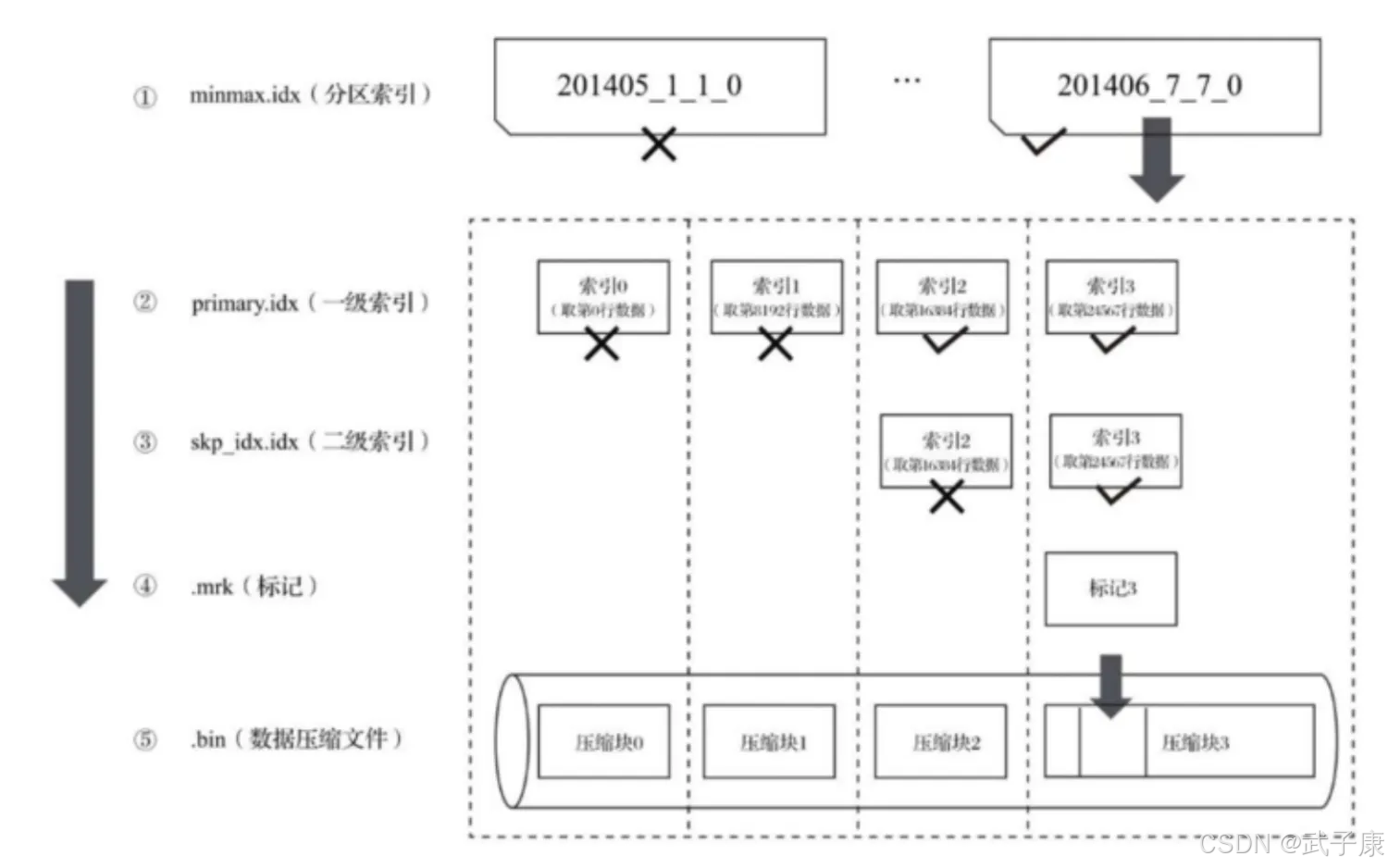 稀疏索引(Sparse Index):这种索引仅针对某些行进行标记,而非为每一行建立索引,从而减少了存储开销。稀疏索引与标记配合使用,使得查询时可以快速跳过无关的数据块。