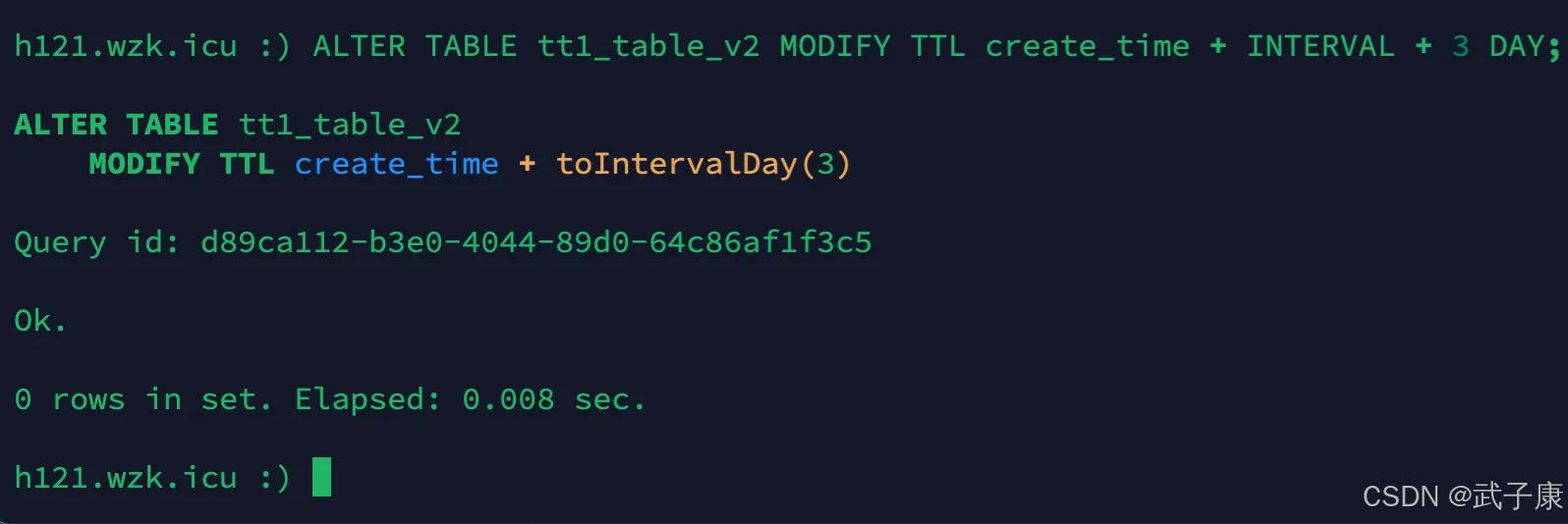 用法:TTL time_col + INTERVAL 3 DAY 表示数据存活时间是 time_col 时间的 3 天后 INTERVAL 可以设定的时间: