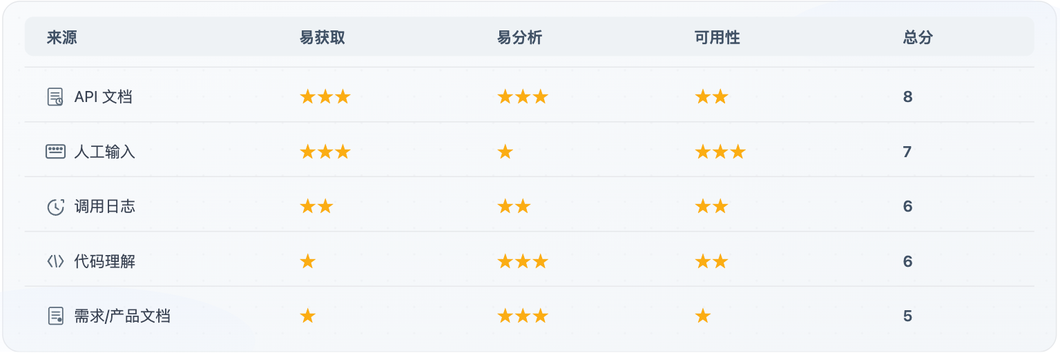 我们对比了人工输入、调用日志、历史代码等来源,从获取成本、分析难度和可用性三个维度评分。结果表明:人工输入和调用日志最优。