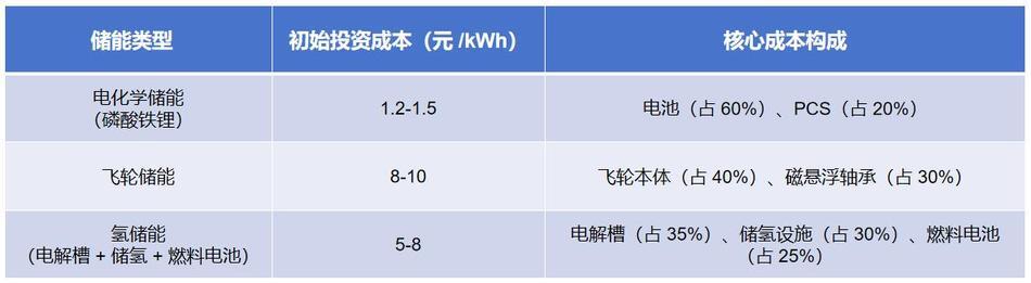日内调峰场景(4 小时循环充放电):电化学储能 LCOE 约 0.4 元 /kWh,飞轮储能约 1.2 元 /kWh(时长不足需频繁充放电,效率下降),氢储能约 1.5 元 /kWh(转化效率低);