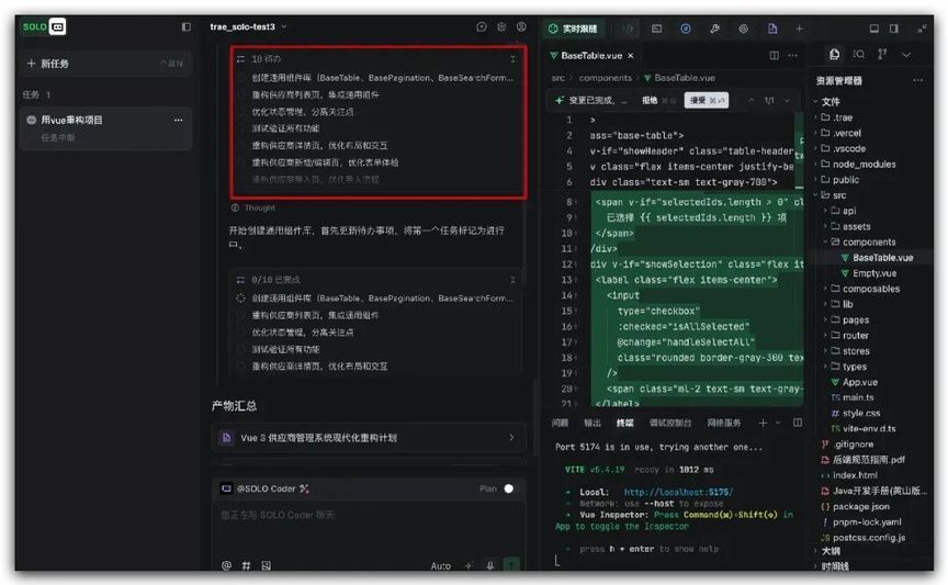 TRAE SOLO 有个 Plan 模式。当你抛出一个复杂需求时,它不会急着写代码,而是先给你列一个 To-Do List,告诉你它准备分几步走。