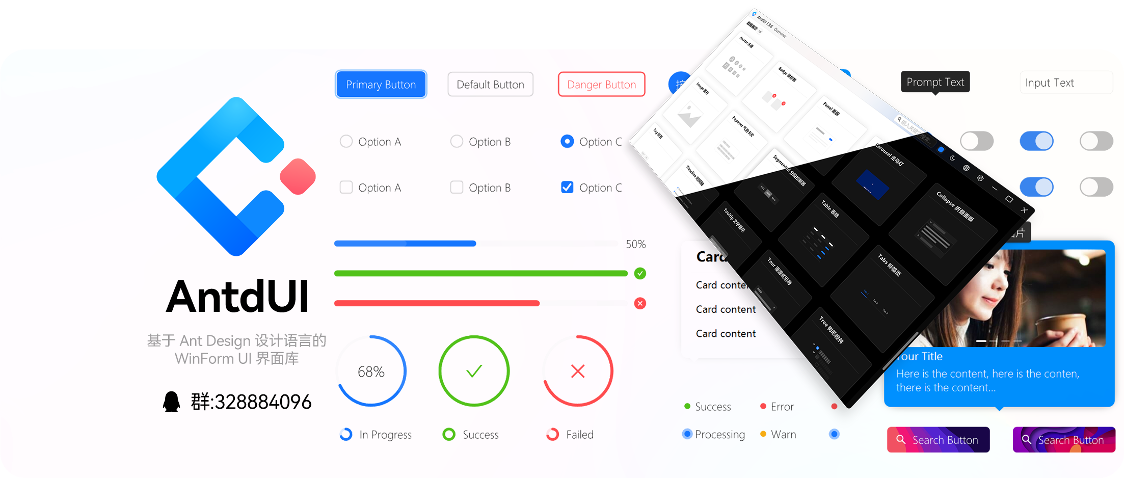 AntdUI 是一款基于 Ant Design 设计语言的开源(Apache License) WinForm UI 界面库,致力于将现代美观的前端设计风格带入到桌面应用程序中。采用纯 GDI 绘图,不需任何图片资源,全面支持 AOT,最低兼容 .NET Framework 4.0。
