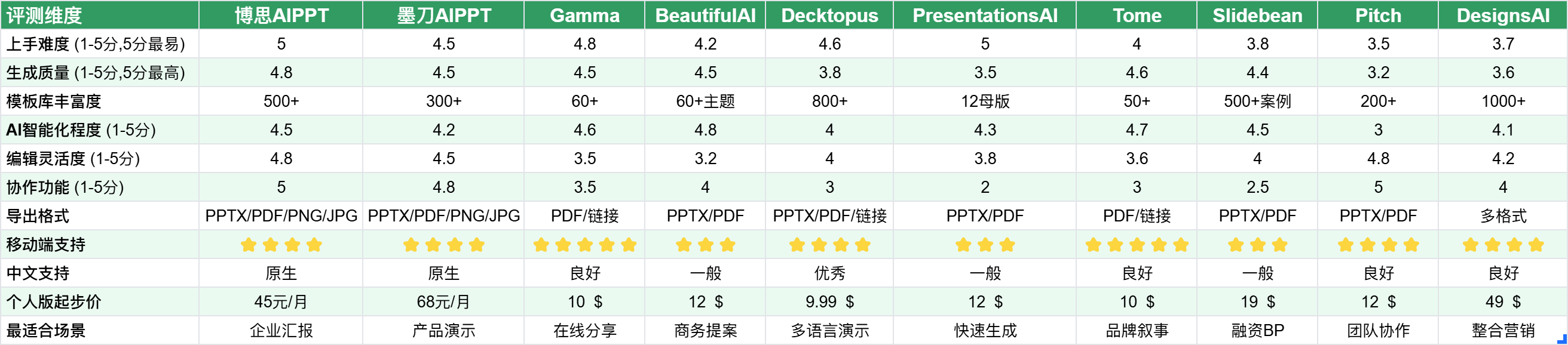 生成质量:包括版式美观度、内容逻辑性、图文匹配度三个子维度,专业级工具生成的 PPT 应该无需大幅修改即可使用。