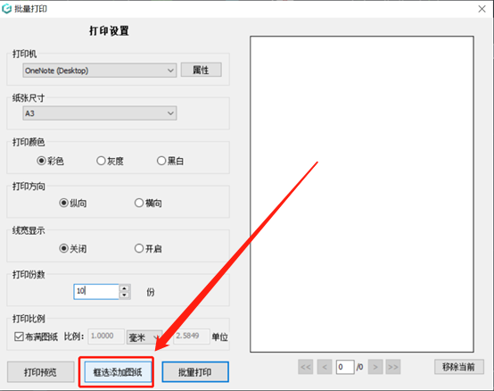 步骤四:CAD 批量打印参数设置完成后,点击【框选添加图纸】按钮。如下图所示: