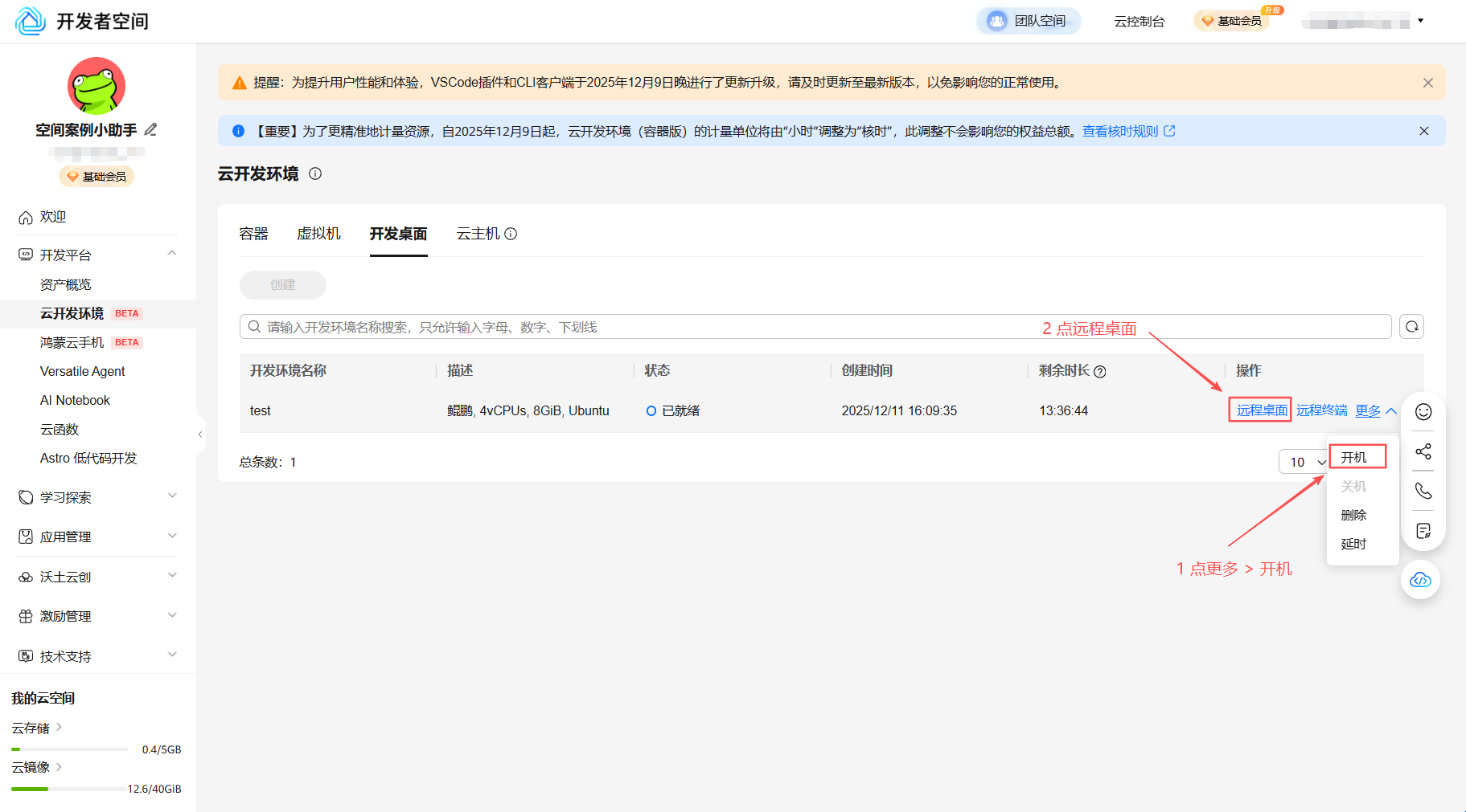 登录华为开发者空间,点击菜单 开发平台 > 云开发环境 > 开发桌面,创建云开发环境 - 开发桌面。